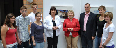 Die Schülerinnen und Schüler der Mörike-Realschule mit ihrer Lehrerin Andrea Maisel im Gespräch mit dem OB von Mühlacker Frank Schneider.